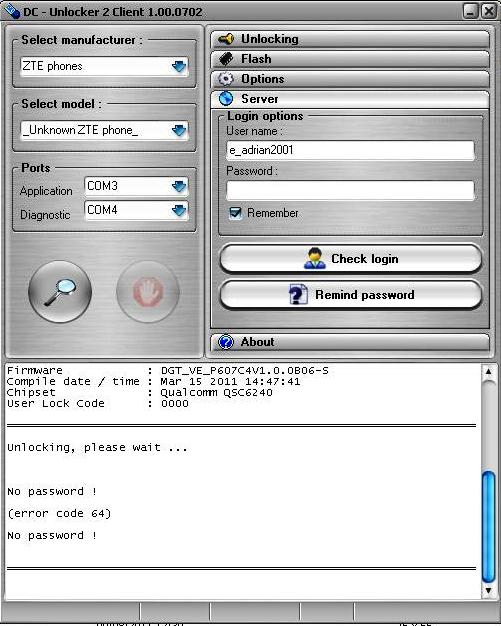 I need help. I have a ZTE F100 locked. I try to unlocked using DC-Unlocker Client 1.00.0702 but when the program tries to unblock the telephone gives me an error code 64. I don't know why the program is giving this error.