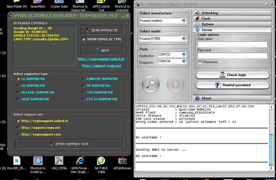 Turn off all Vygis software and other software that is related with your Vygis dongle. Then launch DC-Unlocker, go to server tab and click Check login.