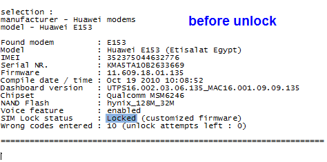 I unlock E153u1 Etisalat Egypt v11.609.18.01.135 compile date : Oct 19 2010 10:08:52 successfully by 7 credits